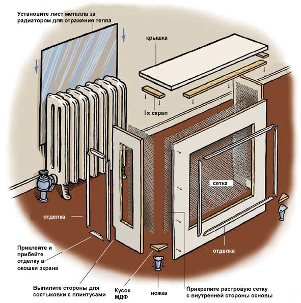 La charge esthétique de la boîte est plus difficile à mettre en œuvre, mais est tout à fait réalisable. Le radiateur situé près du mur peut être décoré sous la cheminée. Dans ce cas, il n'est pas nécessaire d'utiliser de la maçonnerie et l'installation d'une grille forgée. Vous pouvez faire beaucoup plus facilement et fabriquer une boîte à partir d'une feuille de contreplaqué ou de panneaux de fibres.