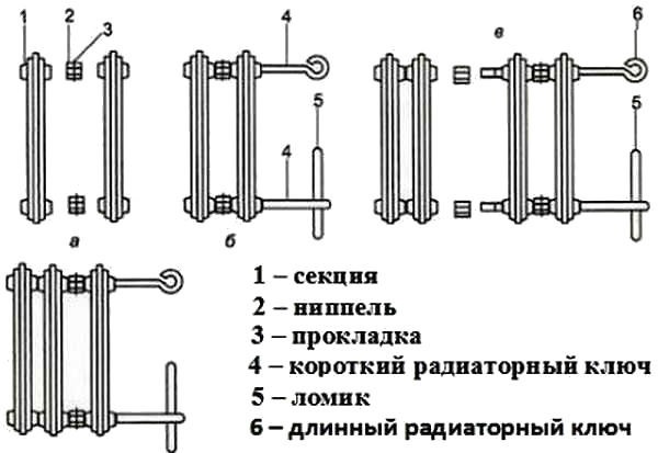 De plus, les radiateurs en fonte sont montés de manière pratique et simple. Les sections des batteries en fonte sont reliées aux tuyaux et entre elles au moyen d'une connexion filetée et de joints en paronite. Une clé spéciale vous permet de déconnecter toutes les sections sans retirer les radiateurs extrêmes.