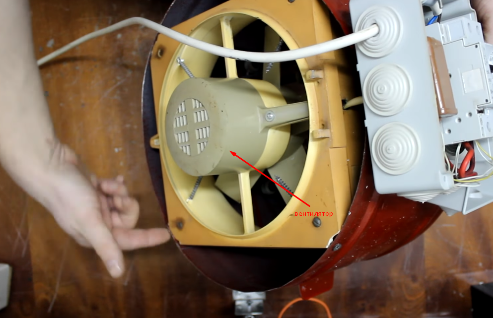 - Support moteur avec ventilateur (vous pouvez utiliser des attaches régulières). La roue doit couvrir l'espace aussi étroitement que possible, mais tourner librement. Les fils sont connectés au réseau via un fusible 6A, équipé d'un interrupteur.