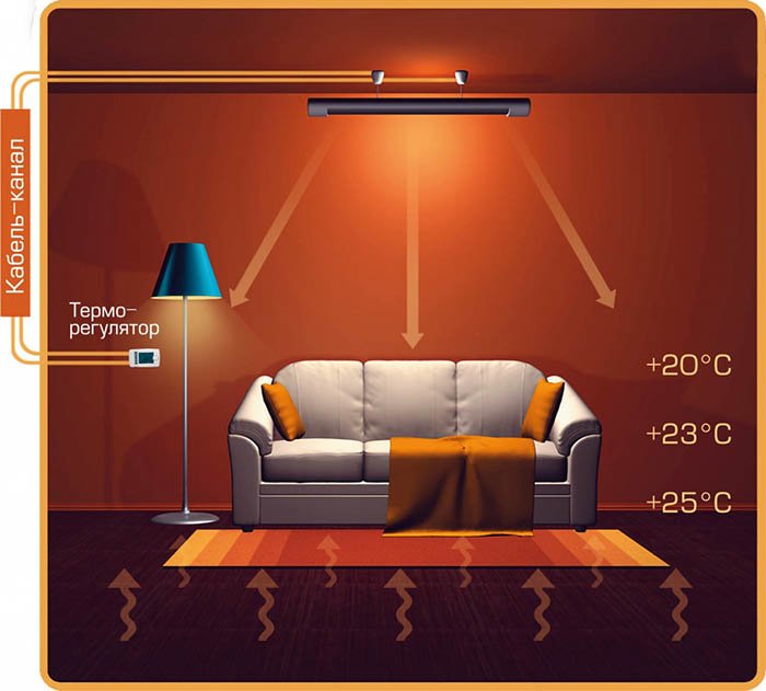 Les rayons infrarouges, pénétrant à la surface des objets et du corps humain, sont chauffés à une profondeur de 2,5 cm. Le chauffage se produit d'une part - à partir du radiateur.