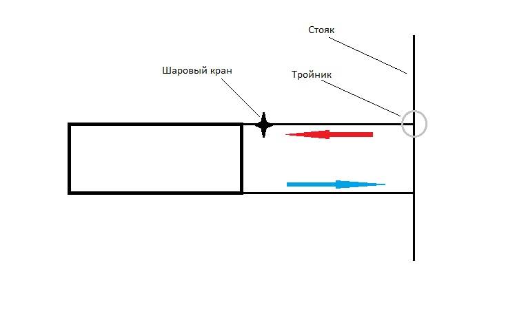 Tout d'abord, je joins un schéma de connexion diagonal pour qu'il n'y ait pas de malentendu. Je dis immédiatement qu'il est nécessaire de vérifier la cause la plus courante du fond froid du radiateur dans ce cas - un blocage.
