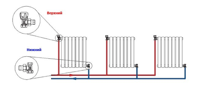 Un tel système est utilisé dans les bâtiments à plusieurs étages avec un flux vertical de liquide de refroidissement. La condition principale est d'installer un cavalier avant de se connecter à un pipeline appelé contourneret tapote pour pouvoir retirer le radiateur sans perturber l'ensemble du système.