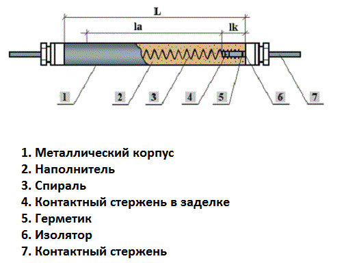 L'élément a une résistivité élevée, il se réchauffe donc rapidement. La spirale est placée à l'intérieur du corps, dans la cavité interne libre restante - remplisseur.
