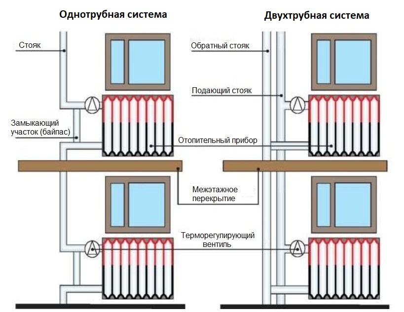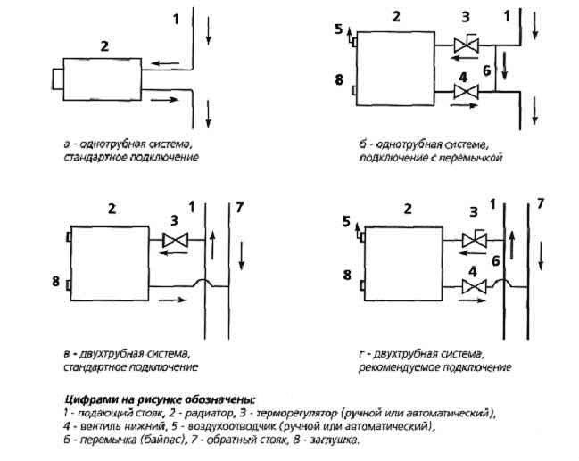 Dans les deux tuyaux, le liquide de refroidissement coule vers radiateur par un tuyau, et est évacué par un autre. Aucune dérivation n'est nécessaire, la vanne thermostatique doit être installée sur le tuyau d'alimentation en eau.