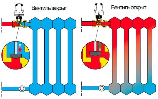 Que se passe-t-il à l'intérieur de l'appareil? Si l'air ambiant chauffe la tête à 21 degrés, c'est-à-dire augmente la température de consigne de 1 degré, il appuie sur la tige, le flux de liquide de refroidissement dans la batterie est complètement bloqué par la valve.