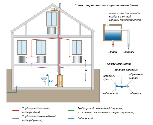 Dans ce cas, vous pouvez même combiner le réservoir de distribution responsable de la disponibilité de l'eau chaude et le vase d'expansion. Si une chaudière non volatile est installée dans la maison, un système de chauffage complètement autonome sera obtenu.