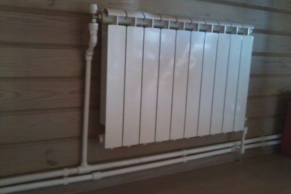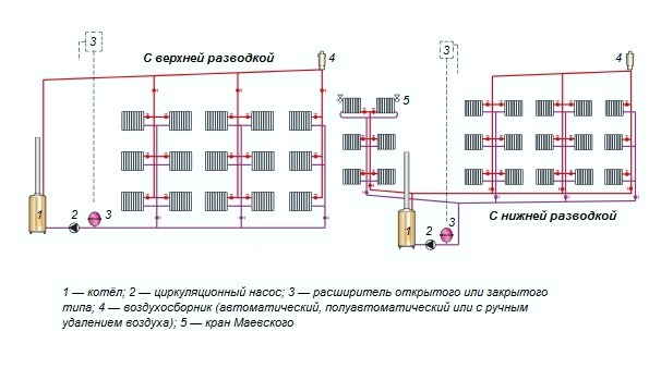 Système d'alimentation en chaleur assez pratique avec un câblage inférieur. Le tuyau d'alimentation est situé en dessous, à côté du retour. Le mouvement du liquide de refroidissement dans le sens du bas vers le haut. L'eau, traversant les radiateurs, est envoyée par une conduite de retour vers une chaudière de chauffage. Les batteries sont équipées Grues Mayevsky pour éliminer l'air de la conduite.