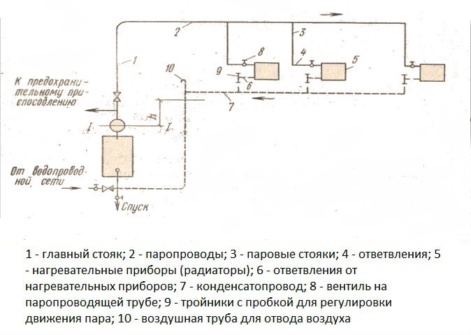 Mais en même temps, la consommation de tuyaux augmente considérablement. Comme l'eau, le chauffage à la vapeur peut être à circuit simple ou double. Dans le premier cas, le système est utilisé uniquement pour chauffer des pièces, dans le second - également pour chauffer de l'eau à des fins domestiques. La répartition du chauffage est également différente.