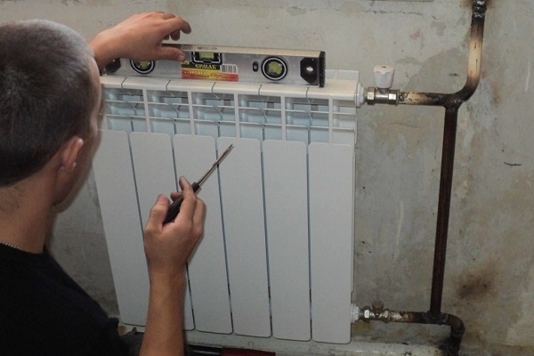 La prochaine étape est la suspension des radiateurs. Pour ce faire, aux endroits indiqués sur le schéma d'installation, des crochets spéciaux sont enfoncés dans le mur, sur lequel les batteries sont montées. S'il est prévu d'utiliser des tubes à ailettes, ils sont fixes.