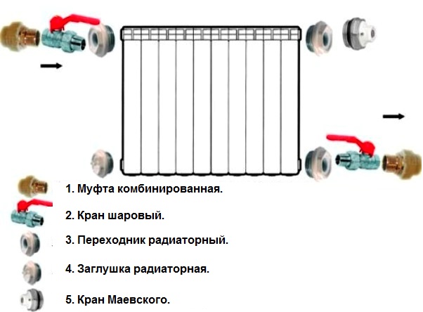 Directement processus de connexion du radiateur cela ne dépend pas beaucoup de la méthode d'alimentation des tuyaux de chauffage. L'alimentation et le retour sont connectés à la batterie en fonction du circuit sélectionné. Et les deux trous restants sont fermés par une grue Mayevsky et un bouchon.