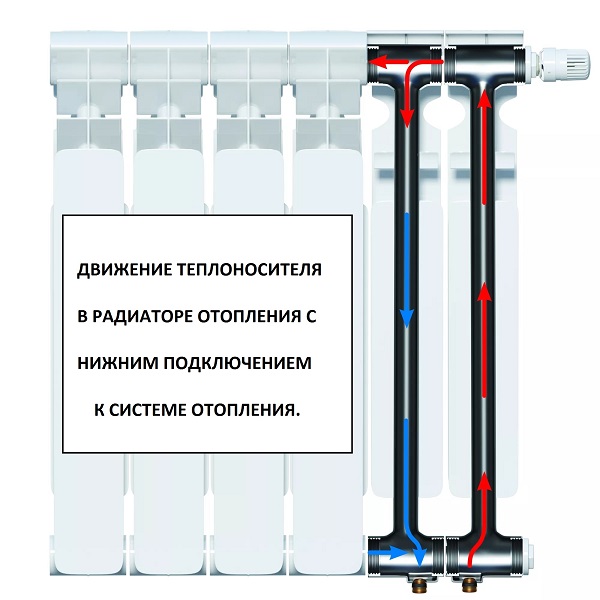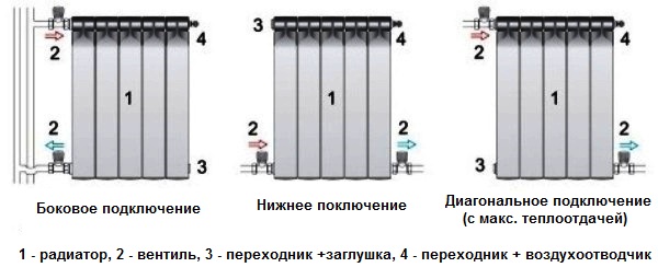L'efficacité de transfert de chaleur du radiateur dépend directement du choix du schéma de raccordement des conduites de chauffage. Si le liquide de refroidissement ne circule pas dans toute sa zone interne, mais pénètre rapidement dans la conduite de retour, la batterie cède au minimum la chaleur.