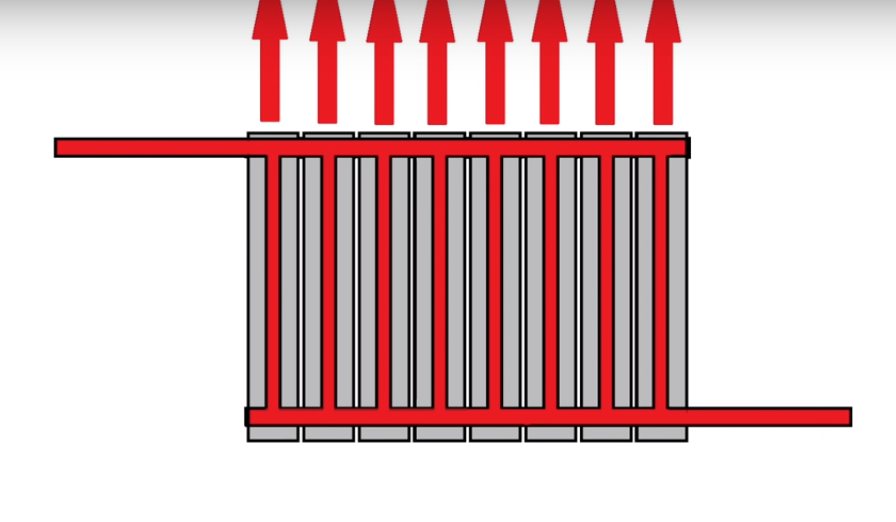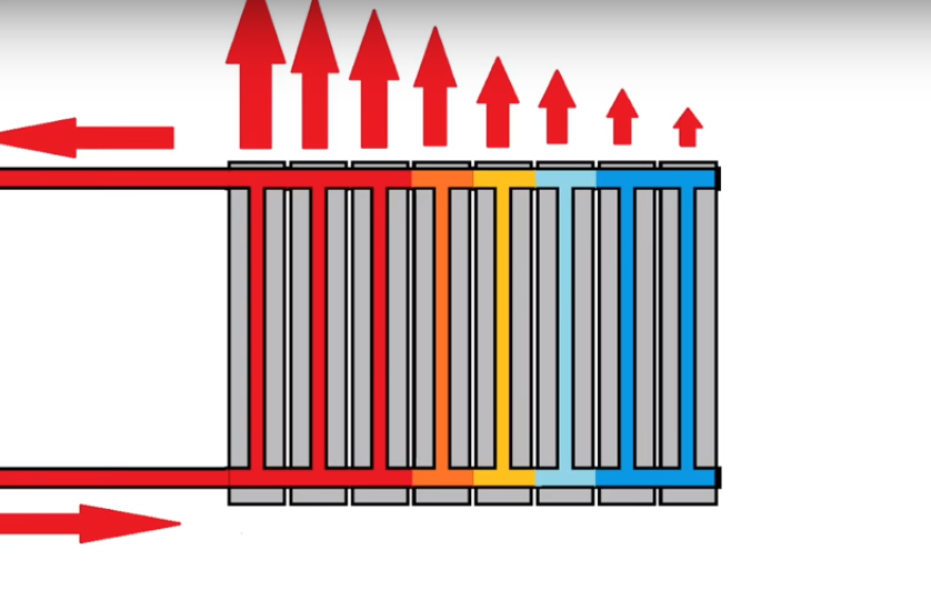 Souvent, la méthode horizontale est obtenue aussi efficace que possible pour la perte de chaleur. Mais cela n'est possible que s'il y a une prise à l'entrée entre les première et deuxième sections de la batterie, qui dirige le liquide de refroidissement vers le haut du radiateur entier. La résistance est donc minimale et le transfert de chaleur maximal.