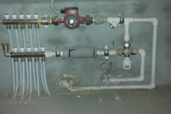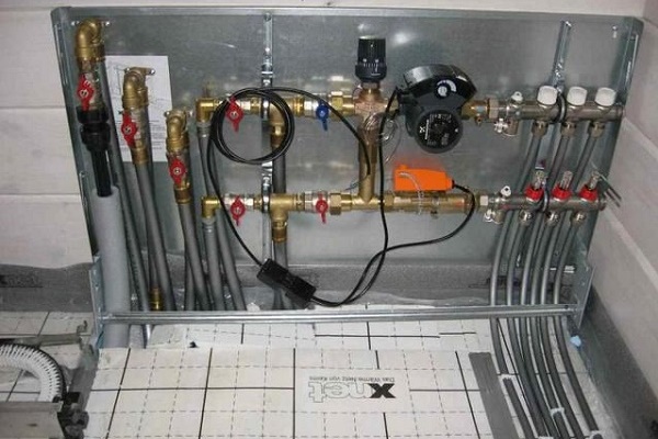 Souvent, le collecteur est équipé d'une unité de mélange pour ajuster la température de l'eau fournie aux tuyaux du plancher chaud. Le fait est que pour les radiateurs, en règle générale, ils utilisent un liquide avec une plage de température de 70 à 80 ° C, tandis que pour un sol chaud, il faut environ 40 ° C.
