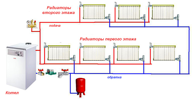 Le tuyau d'alimentation en eau chaude du vase d'expansion et de la conduite de retour doit être le plus épais; les contremarches alimentant le 2ème étage sont légèrement plus fines, leur partie inférieure, au 1er étage - diamètre encore plus petit, et les tuyaux de raccordement du radiateur avec la plus petite section.