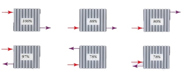 La boucle de Tihelman est la solution la plus réussie et la plus populaire en termes de rapport coût-efficacité. Sa différence est que le sens d'écoulement dans l'alimentation et le retour est parallèle.Par conséquent, quelle que soit la batterie traversée par le liquide de refroidissement, la longueur du cercle de circulation sera la même, le chemin de moindre résistance n'existe pas. Par conséquent, toutes les batteries sont chauffées uniformément, mais chacune d'elles peut être réglée séparément ou complètement éteinte sans affecter le fonctionnement du système.