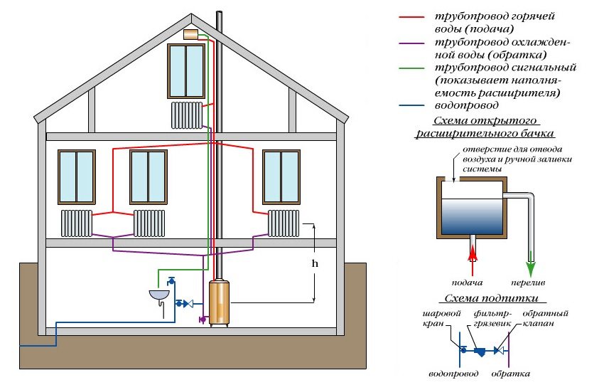 Le vase d'expansion compense l'augmentation du volume de fluide pendant le chauffage, empêchant l'augmentation de la pression dans le système. Le réservoir de type ouvert a une ouverture sur le dessus et fonctionne simplement en raison du stock de volume, se remplissant à différents niveaux. Pour que l'eau ne déborde pas selon le principe des vases communicants, un tel réservoir doit être installé au point le plus haut du système. Dans une maison à deux étages, en règle générale, c'est le haut de la colonne montante.
