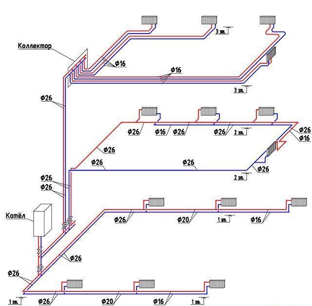 Le circuit collecteur implique la présence de deux collecteurs, pour l'alimentation et le retour, dont les paires de tuyaux vers chaque appareil de chauffage sont séparées par des rayons. Pour de meilleures performances collectionneur positionné de manière à ce que la distance de celui-ci à chaque appareil de chauffage soit approximativement la même. Habituellement, un collecteur séparé est installé à chaque étage.