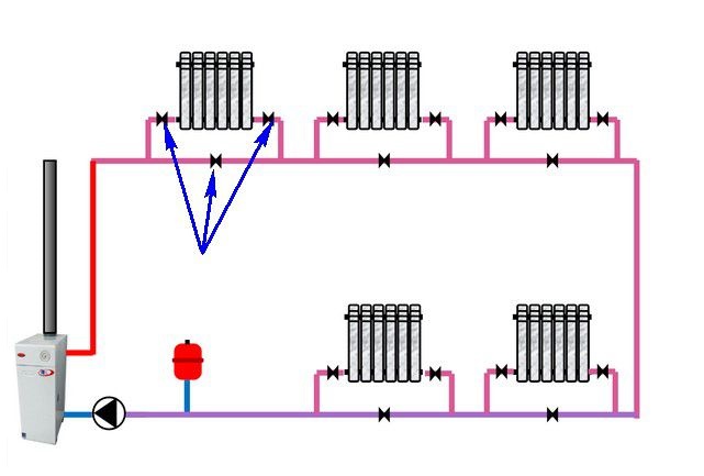 Comme nous l'avons déjà mentionné, ce schéma de connexion fournit le fonctionnement le plus efficace et le réglage pratique de chaque radiateur à un coût relativement faible des matériaux.