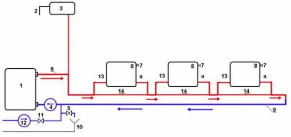 Le schéma est comme-si ... fait, maintenant nous souffrons - sur 5 batteries, 3 ne chauffent pas. Ceux près de la chaudière chauffent, mais les 3 lointains ne chauffent pas. L'eau passe à travers le tuyau, mais ne pénètre pas dans les batteries. Si seulement il était possible de le refaire avant le froid, de sorte que le tuyau soit celui qui entrait immédiatement dans la batterie et sortait de l'autre extrémité de la batterie. Et puis le gaz est brûlé pour rien, et les batteries sont froides.