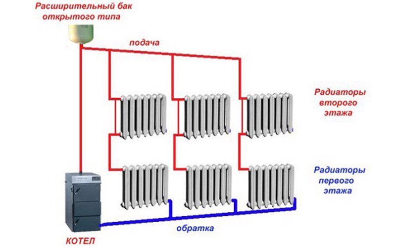 Des dispositions verticales de l'installation de Leningradka sont utilisées dans les maisons à deux étages d'une petite zone. Par analogie, ils peuvent être de type ouvert ou fermé, représentés par des circuits à circulation forcée et à gravité.