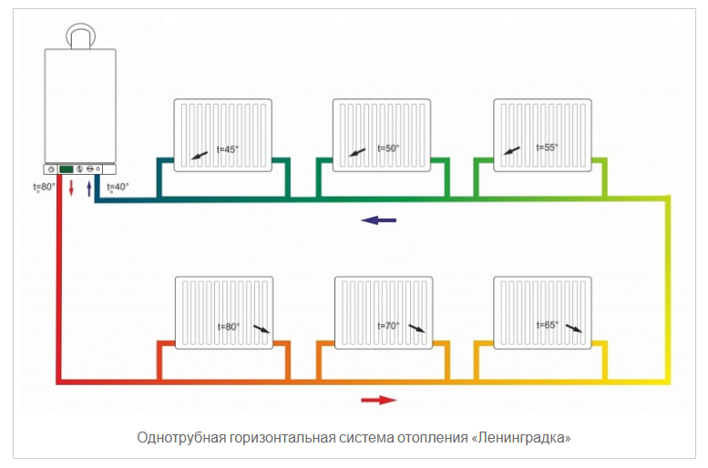 Nommé «Leningradka» système de chauffage monotube adapté aux bâtiments résidentiels à un ou deux étages d'une petite superficie, le nombre optimal de radiateurs est jusqu'à 5 pièces.