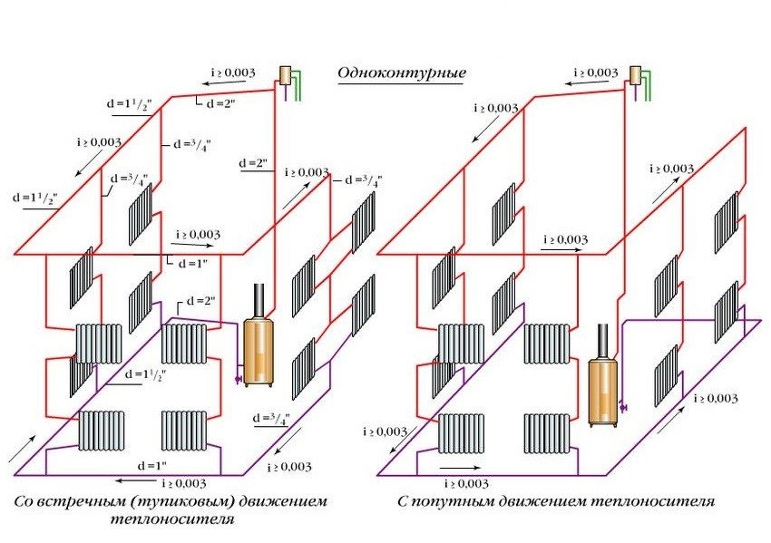 Conformément au sens de circulation de l'eau dans les canalisations d'alimentation et de retour, l'apport de chaleur peut être lié au mouvement de caloporteur associé et à impasse. Dans le premier cas, l'eau se déplace dans les autoroutes dans un sens et dans le second - dans des directions différentes.