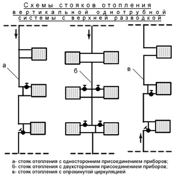 Il existe également un schéma bifilaire dans lequel toutes les premières moitiés des appareils sont d'abord connectées en série, puis, pour assurer l'écoulement inverse de l'eau, leurs deuxièmes moitiés.
