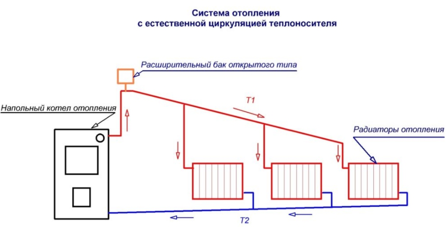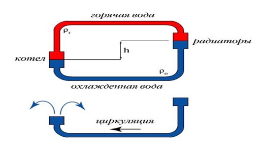 Circulation naturelle. Ses performances sont basées sur la différence de densité entre chaud et froid. Les positions supérieures d'un tel système sont occupées par l'eau chaude et les inférieures par le froid. Le refroidissement, l'eau chaude descend et le réchauffement.