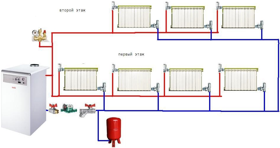 Dans un circuit de chauffage à deux tuyaux, comme son nom l'indique, non pas un, mais deux tuyaux sont impliqués. Dans le même temps, chacune des batteries est connectée dans un tuyau à la conduite principale par laquelle le liquide de refroidissement est alimenté, et la seconde au tuyau de retour. Il s'avère que des tuyaux séparés sont prévus pour le liquide de refroidissement chaud et refroidi.
