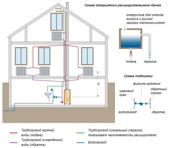 Système de chauffage ouvert se compose d'une chaudière (n'importe laquelle est utilisée sauf électrique), de canalisations, de radiateurs et d'un vase d'expansion, qui reçoit l'excès d'eau lorsqu'il se dilate pendant le chauffage.