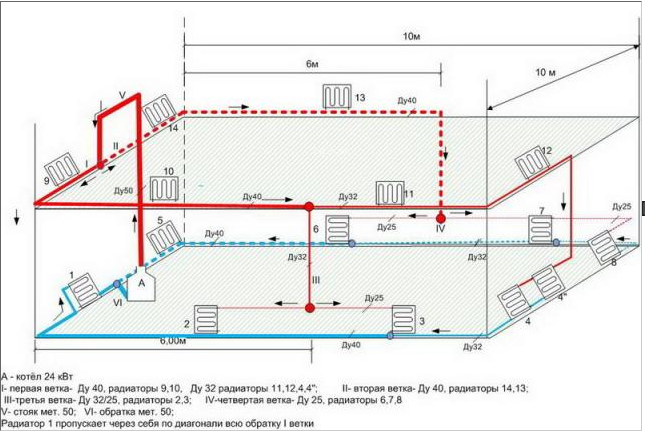 Si au rez-de-chaussée le système chauffe moins, vous devez le refaire ou le mettre à niveau. Mais pour commencer, il convient de vérifier si tout fonctionne correctement: les tuyaux ne sont pas obstrués, vérifiez le bon fonctionnement des bouches d'aération (s'il n'y en a pas, installez-le). Si cela n'aide pas, alors procédez à la modernisation: ajoutez un contour, une flèche hydraulique, refaites le retour (selon la situation). Je joins plusieurs schémas de chauffage pour une maison à deux étages à titre d'exemple.