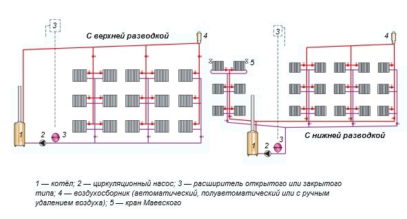 - Par l'emplacement des tuyaux d'alimentation et de retour. Il y a un câblage supérieur ou inférieur. La première consiste à déposer l'alimentation aux points les plus élevés du système, de sorte que le liquide de refroidissement coule dans les appareils par le haut. Selon la deuxième situation, le flux de retour se situe en dessous des radiateurs.