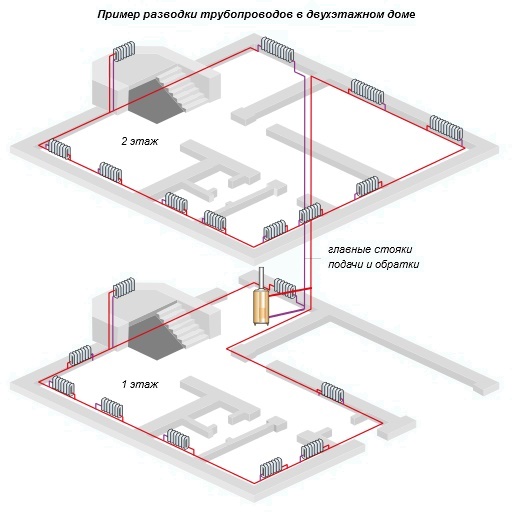 La principale différence entre les structures à deux tuyaux est l'utilisation de deux branches: alimentation et retour. Le premier sert à fournir du liquide de refroidissement chaud aux radiateurs, le second - à renvoyer l'eau vers la chaudière.