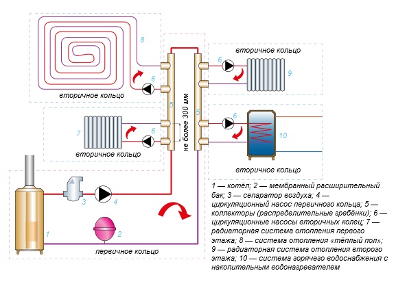 Unité de distribution - le collecteur est équipé de nombreux robinets, de sorte que vous pouvez contrôler le transfert de chaleur de chaque appareil individuellement, éteignez-le pour réparation. Si souhaité et capacités financières, chaque succursale peut être équipée de son propre dispositif de pompage.