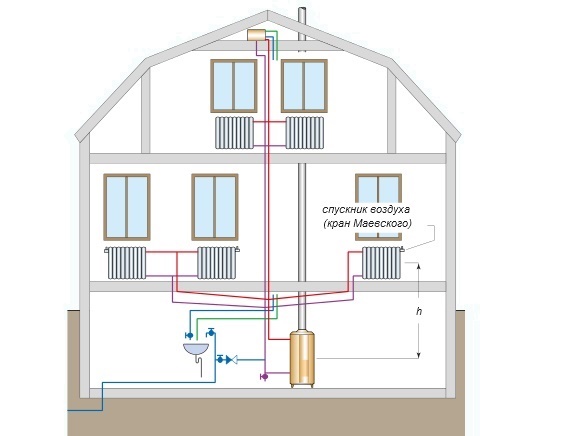 Le chauffage avec câblage supérieur est aménagé dans des chalets sans sous-sol, mais avec un grenier. Parfois, en l'absence de grenier, l'approvisionnement est effectué le long de la ligne d'interface entre le plafond et les murs, ce qui affecte négativement l'image intérieure. La disposition inférieure convient aux maisons à toit plat sans toit, mais avec sous-sol.