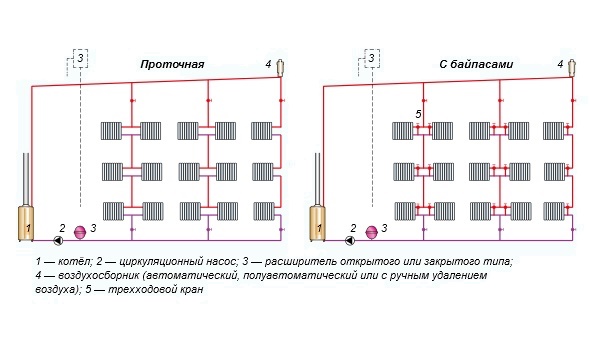 Mise en œuvre en système de dérivation vous permet de rediriger partiellement le fluide chaud vers les appareils suivants, de sorte que presque toutes les batteries reçoivent et dégagent des quantités de chaleur presque égales. Le mouvement de l'eau chauffée est contrôlé soit par deux vannes installées sur la dérivation et le tuyau d'alimentation, soit par une vanne à trois voies.