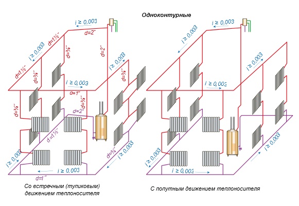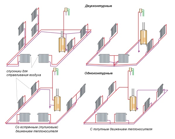 Le schéma de câblage à deux tuyaux est utilisé dans les systèmes avec les deux types de mouvement de liquide de refroidissement. Selon le nombre de contours traités, il peut s'agir d'un circuit simple et double.