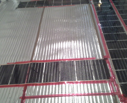 La structure assemblée est recouverte de polyéthylène et de treillis d'armature. Fixez la grille de montage avec des vis autotaraudeuses, mais avec précaution afin de ne pas toucher les contacts. La maille sur le dessus doit être remplie d'une chape ciment-sable et tester à nouveau le système. Une fois la chape sèche, ils posent le carreau sur la colle.