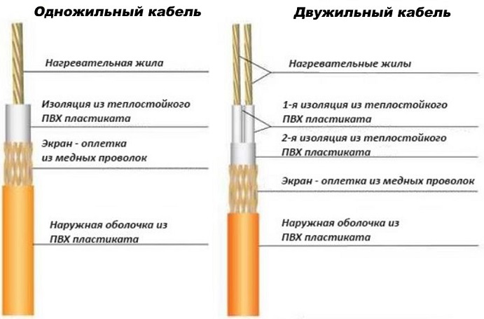 - Deux cœurs. Le câble se distingue par la présence d'un deuxième noyau d'alimentation. Cela vous permet de le monter avec un grand confort. La connexion des deux extrémités de la section de chauffage n'est pas nécessaire, ce qui peut réduire considérablement la consommation de câbles. De plus, il émet beaucoup moins, c'est un avantage non négligeable.