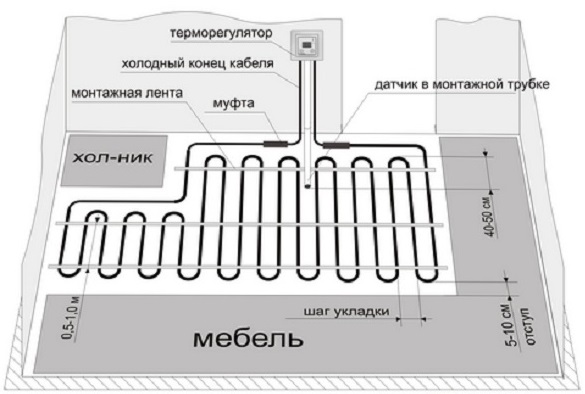 Les extrémités des fils sont connectées au thermostat, menant dans la boîte de montage. Vous pouvez utiliser un plancher chaud sans installer de thermostat, mais cela fonctionnera de manière inefficace, il vous donnera une énergie excessive et une température ambiante inconfortable.