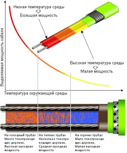 Par conséquent, le câble ne chauffe que lorsqu'il se refroidit et se déconnecte lorsqu'il est en surchauffe. Ces appareils de chauffage peuvent fonctionner sans connecter de thermostat, car ils déterminent eux-mêmes le besoin et la durée du chauffage.