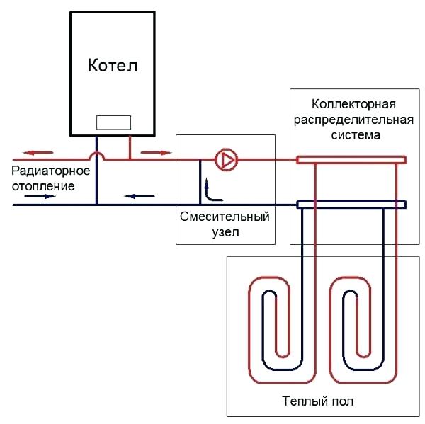 Numéro d'option 2. Connexion du système à la chaudière. Il y a des subtilités ici aussi. Les SNiP interdisent le chauffage des sols au-dessus de 30 ° C, de sorte que la température du liquide de refroidissement ne peut pas être supérieure à 35 ° C.