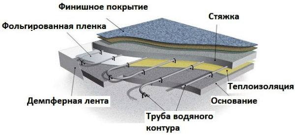 Le chauffage au sol à eau est très facile à installer. Sous la finition du sol sous la forme d'une boucle fermée, des tuyaux sont posés le long desquels le liquide de refroidissement est lancé. Selon le type de système de chauffage, il peut s'agir d'une solution d'antigel ou d'eau, etc.