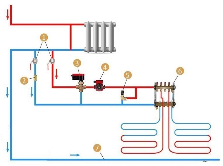 Parfois, au lieu du schéma «chaudière - groupe mélangeur-collecteur - circuits», d'autres options de raccordement d'un plancher chaud sont utilisées. Et le plus commun d'entre eux est la connexion du circuit ECP au radiateur de chauffage.