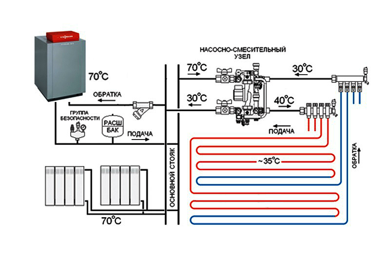 Pour régler la température souhaitée, une ligne de retour est connectée aux circuits et réglée unité de mélangemélange des flux.