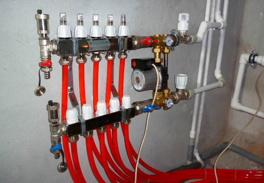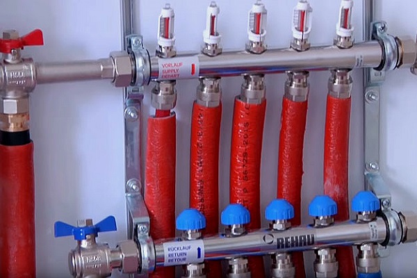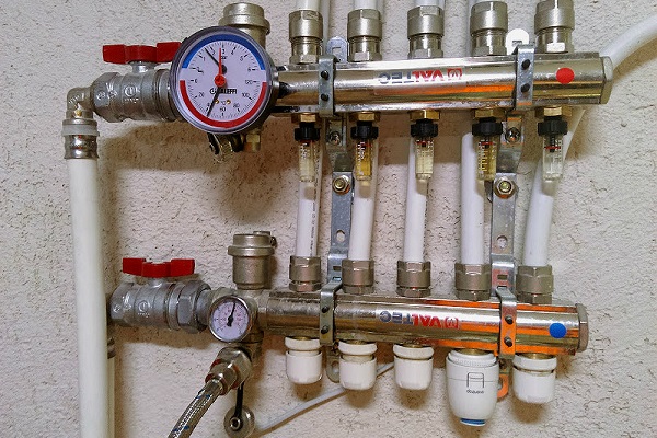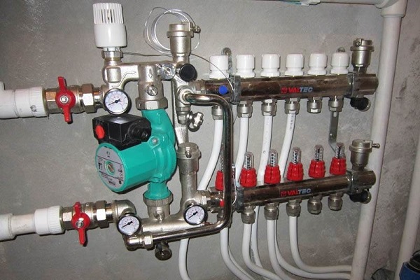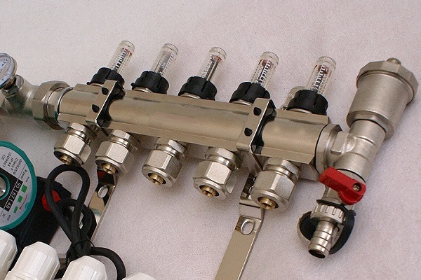 Les circuits ECP sont connectés au système de chauffage via un collecteur de distribution. Il s'agit d'une unité qui vous permet de régler le débit du liquide de refroidissement, de contrôler la température et le débit, d'équilibrer les circuits et d'éliminer l'air du système. Pour chaque fonction, des éléments individuels sont responsables: la pompe, débitmètres, manomètre, thermostats.