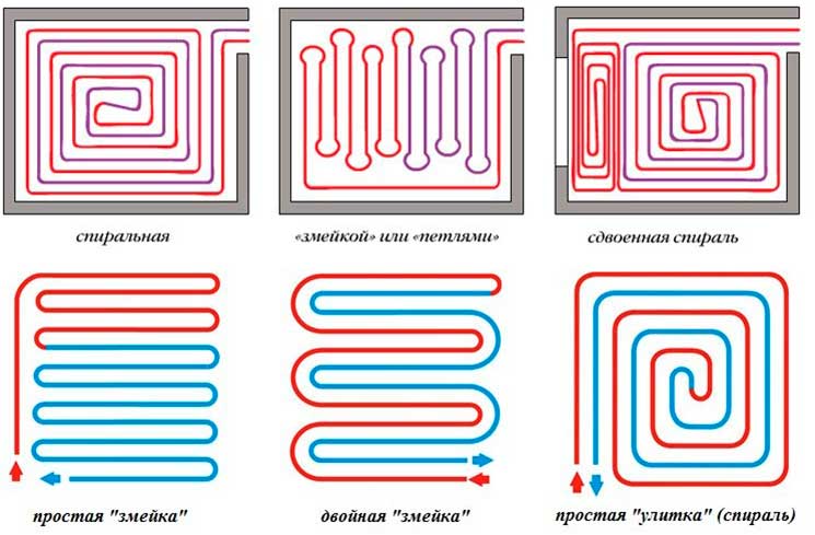 Lorsque vous choisissez un schéma de câblage pour un plancher chauffant à l'eau dans un appartement, vous devez tenir compte de la taille de la pièce. Par exemple, dans le couloir ou la salle de bain, vous pouvez vous en tirer avec un serpent, mais dans de grandes zones, vous devez utiliser un style en spirale.
