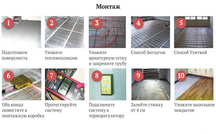 Lors de la pose du système de câbles, le sol en béton est d'abord nivelé, puis un treillis d'armature ou un ruban de fixation spécial est posé dessus. Un câble est posé dessus, fixé, puis coulé avec un mélange de béton. Lorsque la chape est sèche, posez le linoléum.