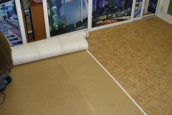 Une fois les travaux d'isolation terminés, vous devez utiliser du ruban adhésif pour fixer la position du film sur le sol afin qu'il ne bouge pas pendant la pose du linoléum.