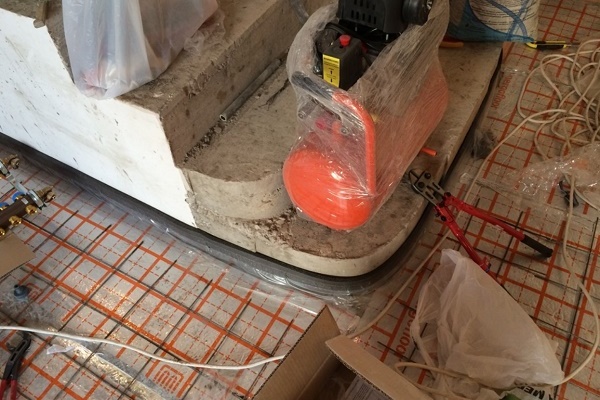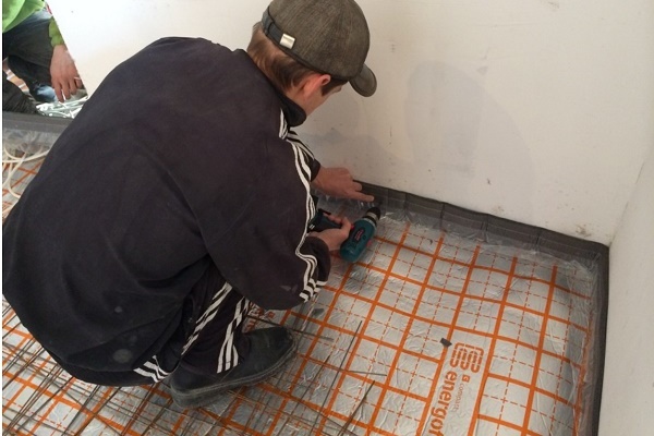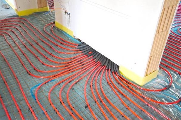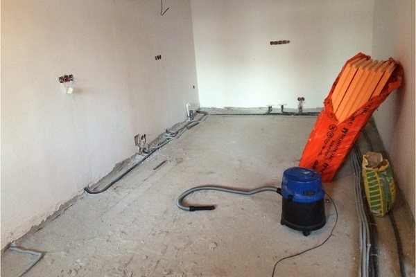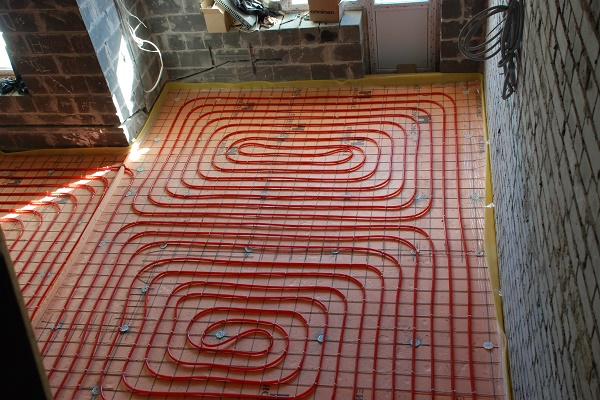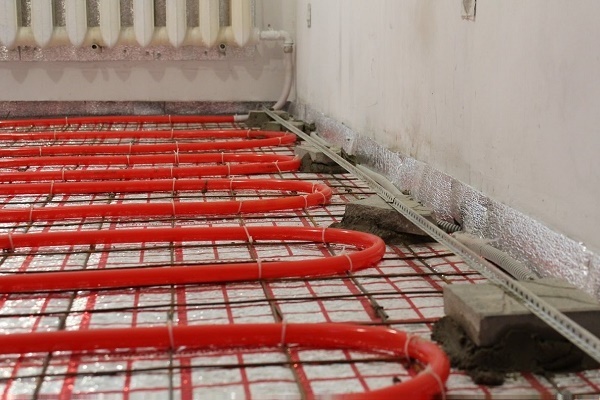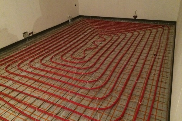 Parallèlement aux tuyaux du chauffage au sol, les tuyaux de chauffage peuvent aller. Ils sont posés de telle sorte qu'ils se trouvent en dessous du circuit de chauffage ou, au moins, ne dépassent pas au-dessus des plaques de polystyrène.